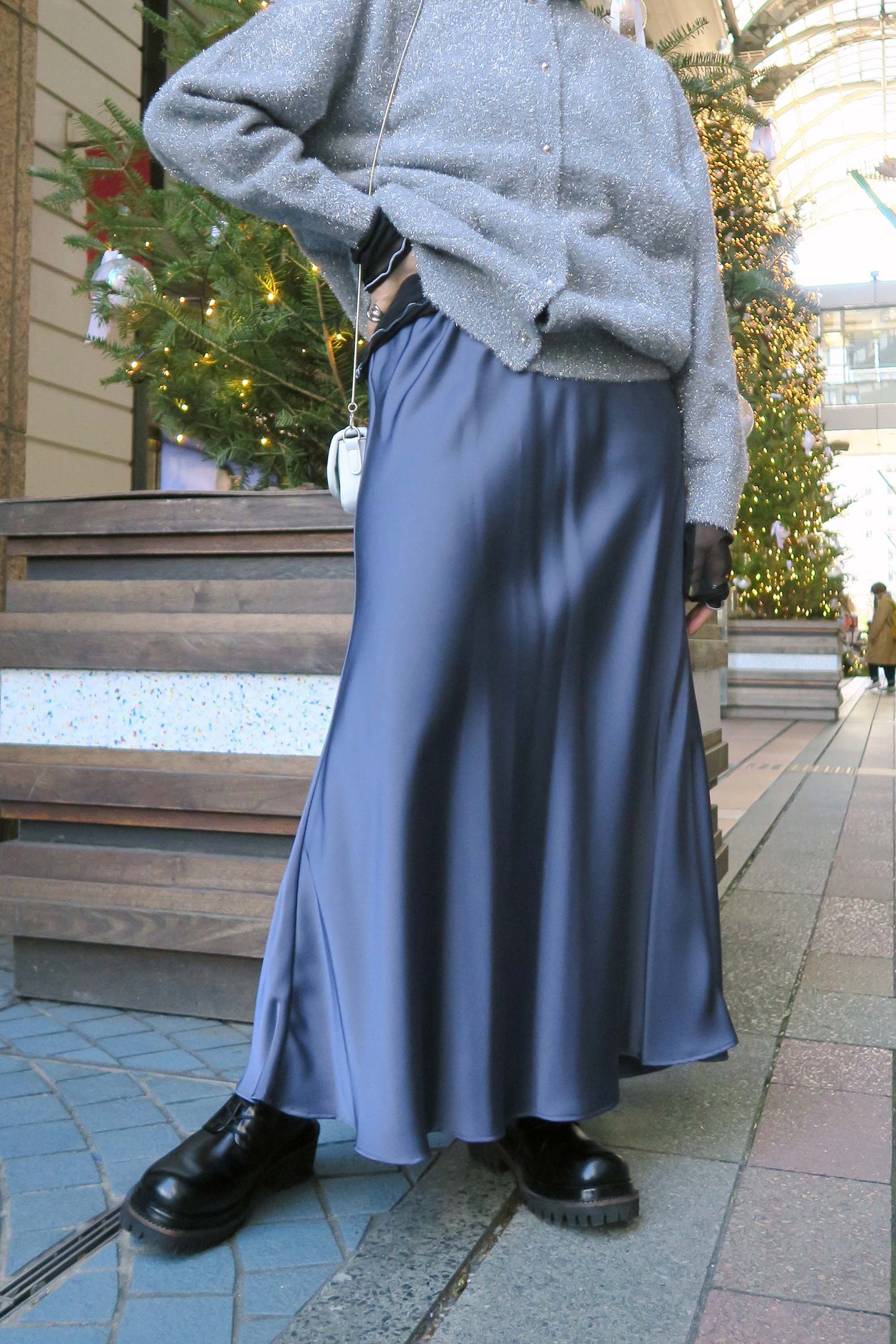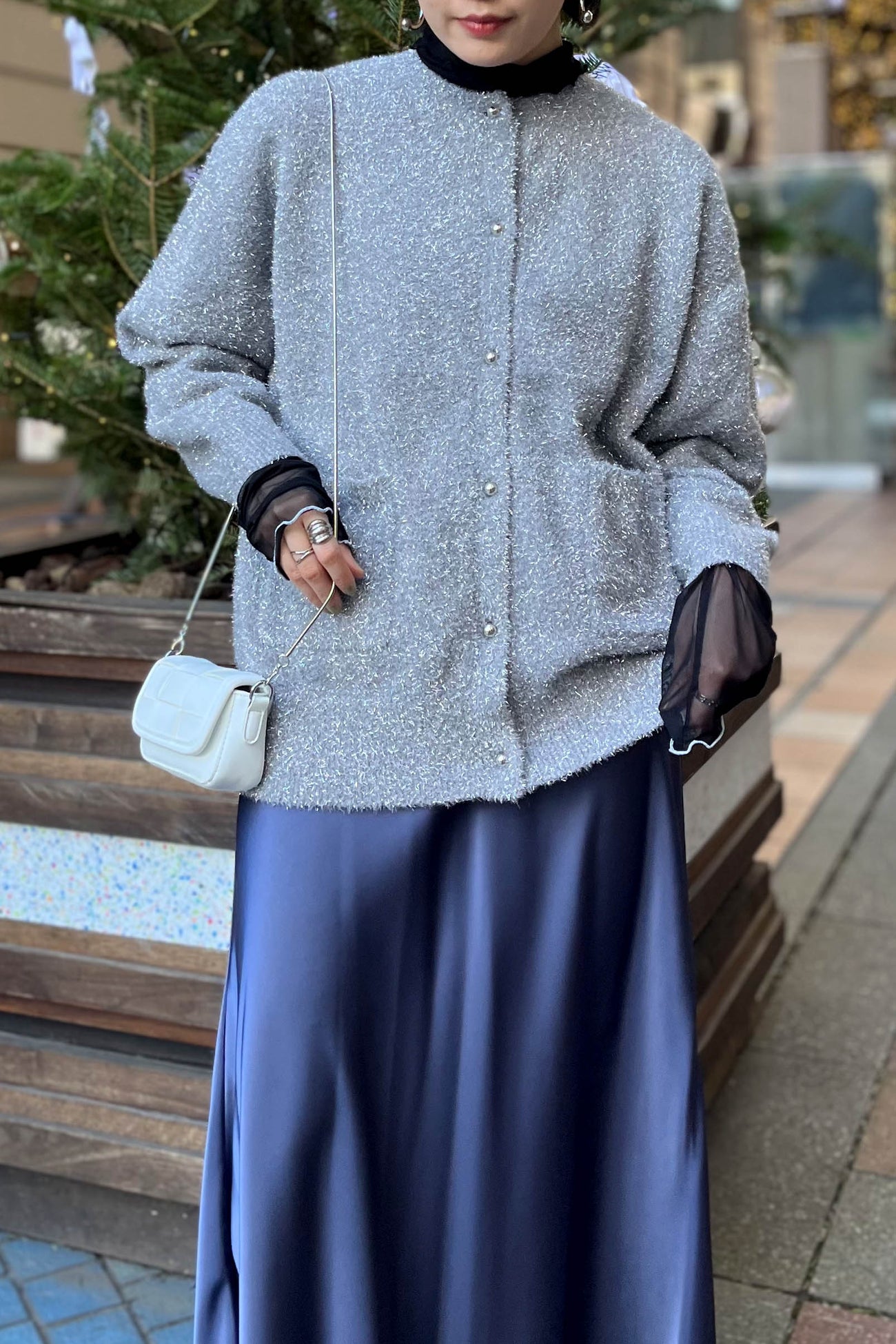 キラキラ光るラメとシルバーボタンが、 シンプルながら華やかに仕上げてくれるラメニットカーディガン。上品な光沢のサテンスカートがさらにラグジャリー感をプラス。クリスマスディナーや女子会など、ちょっと気分を上げてドレスアップしたい時におすすめです♪