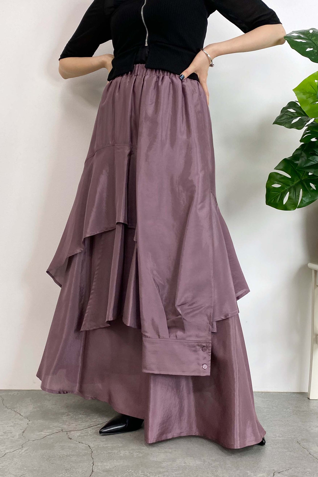 光沢が美しいポリエステルタフタのティアードスカート。贅沢なティアードがドラマティックなスタイリングに仕上げてくれ、ポリエステルタフタの軽やかな風合いがフェミニンさもプラスしてくれるアイテムです。
